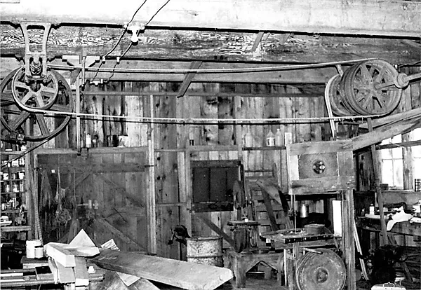 Wolf Creek Boatworks owner Sam Romey says the flat belt driven shop machinery, shown in the 1940s, has not changed much in the last 80 years. (Photo courtesy of Sam Romey)