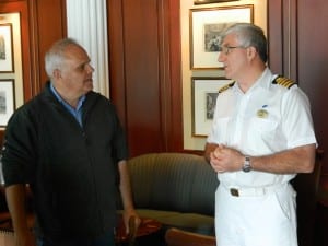 City Mayor Lew Williams III and Grand Princess Captain Tony Herriott talk before the plaque exchange ceremony Wednesday on board the ship.