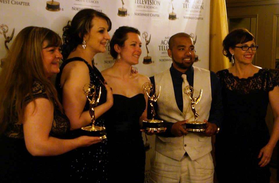 EmmyAwards Patti Mackey, Laurel Lindahl, Lacey Simpson, Kyle Aramburo and Deby Santos are seen after winning regional Emmy awards Saturday night for the Ketchikan Story Project documentary series. (Photo courtesy Ketchikan Story Project)