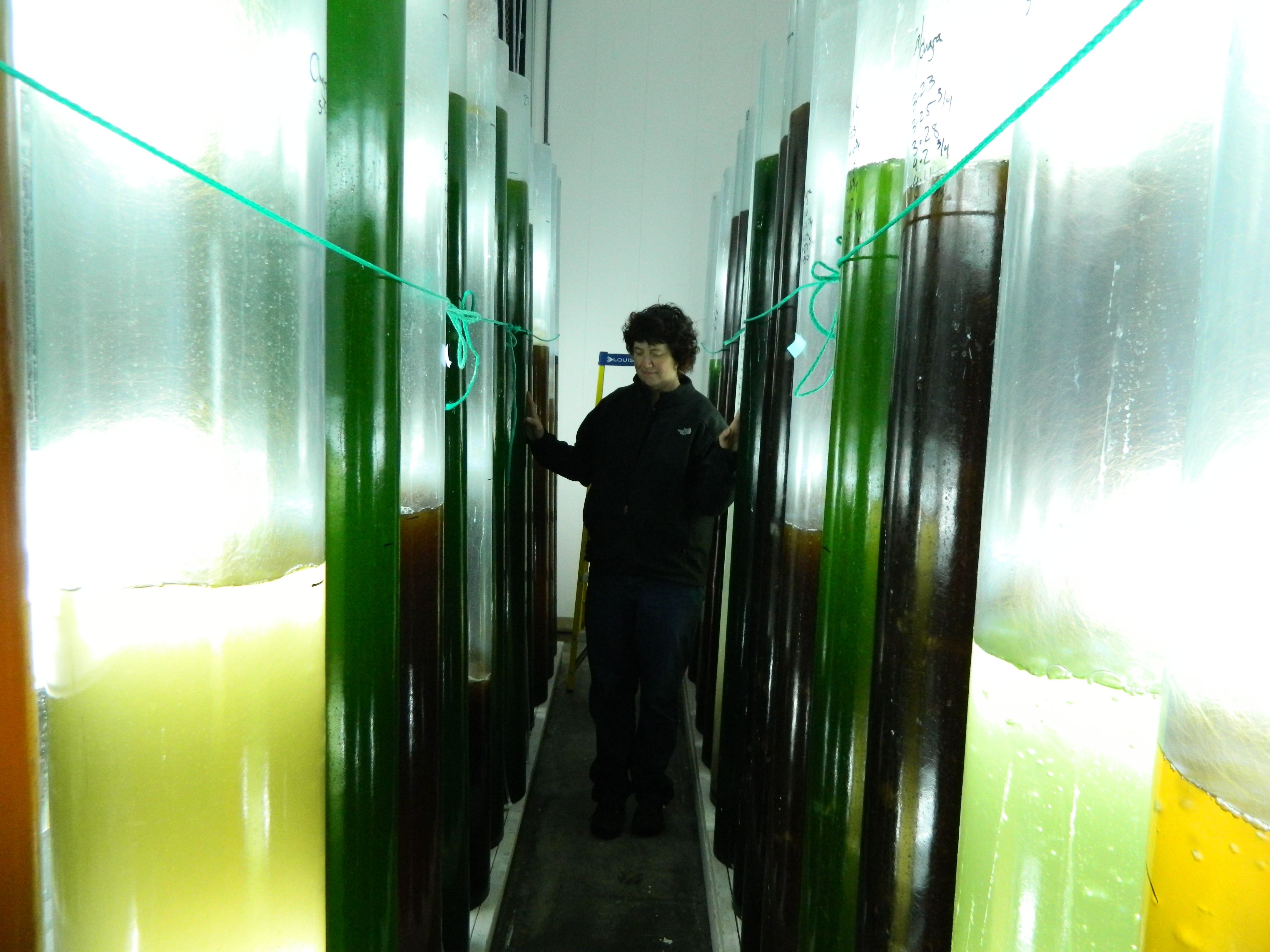 OceansAlaska employee Barbara Morgan inspects algae that the organization grows to feed developing oyster seeds.