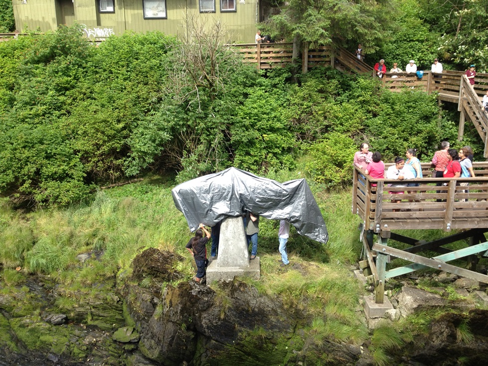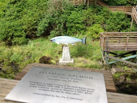 One of the many local events celebrating July 4th was the unveiling of the replacement salmon sculpture at the foot of the fish ladder on Ketchikan Creek.