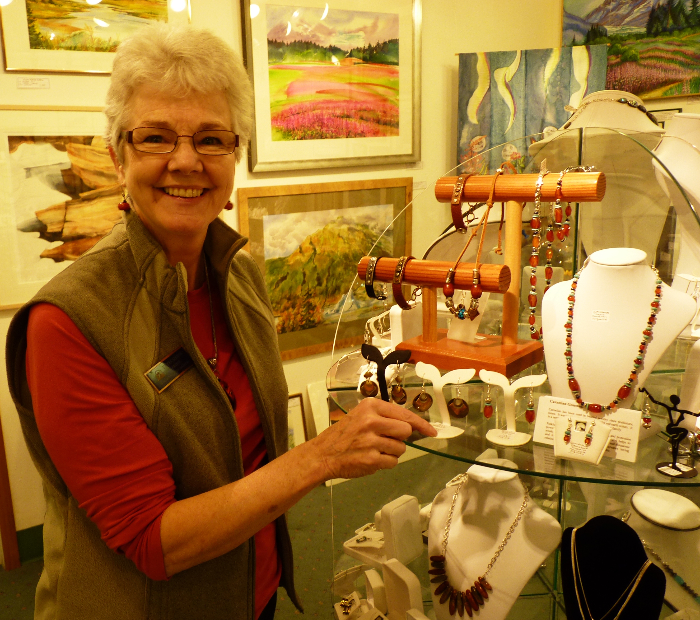 Thyes Shaub shows some of her jewelry at the Juneau Artist Gallery, a cooperative store in the capital city’s tourist district. (Ed Schoenfeld/CoastAlaska News)