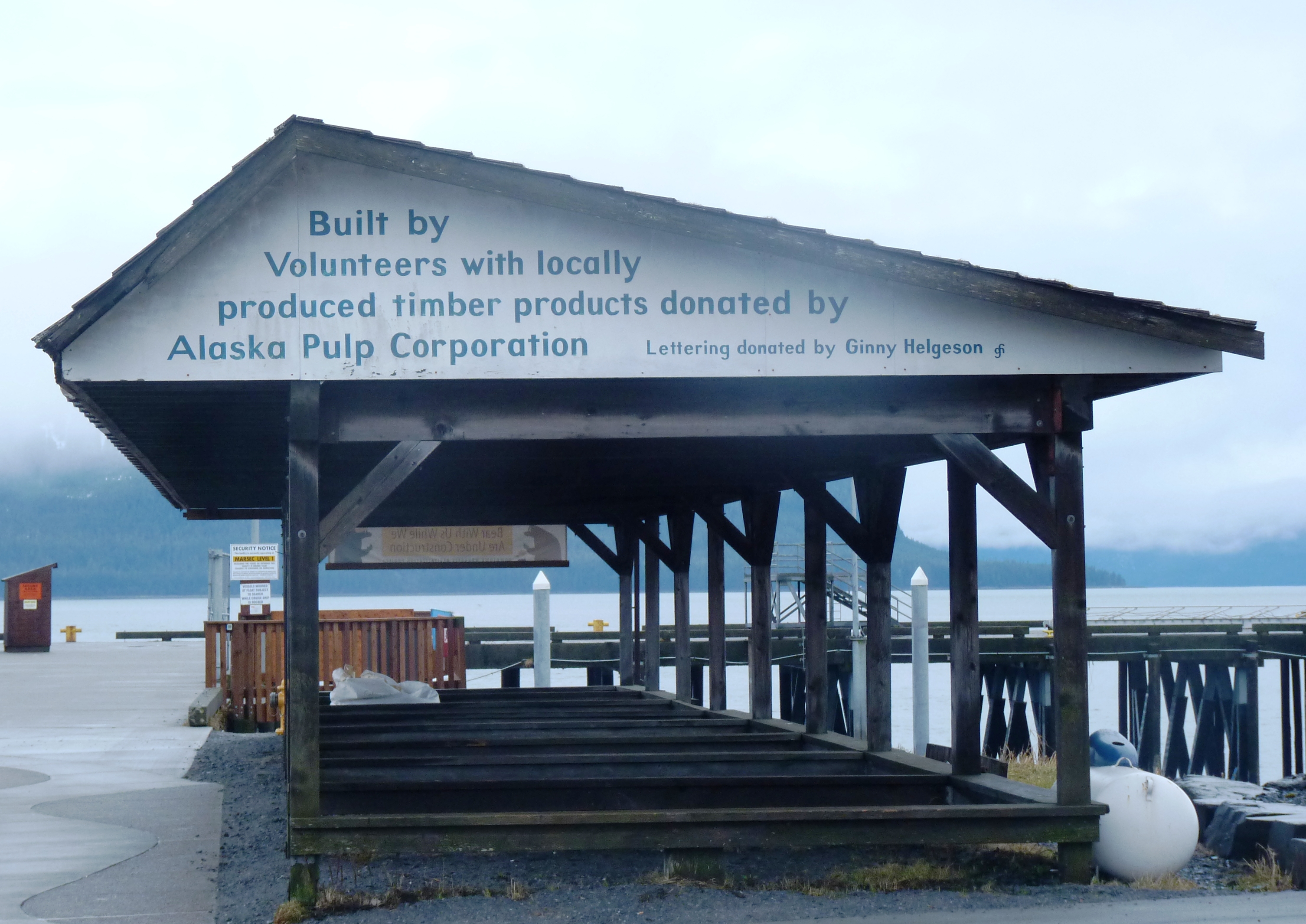 A shelter on Wrangell’s waterfront harks back to the days when timber was king. (Ed Schoenfeld/CoastAlaska News)