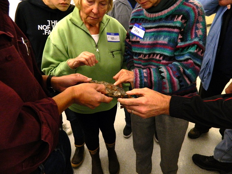 BioBlitz participants examine sea squirts, native and invasive, on a collection plate during the lab portion of the workshop.