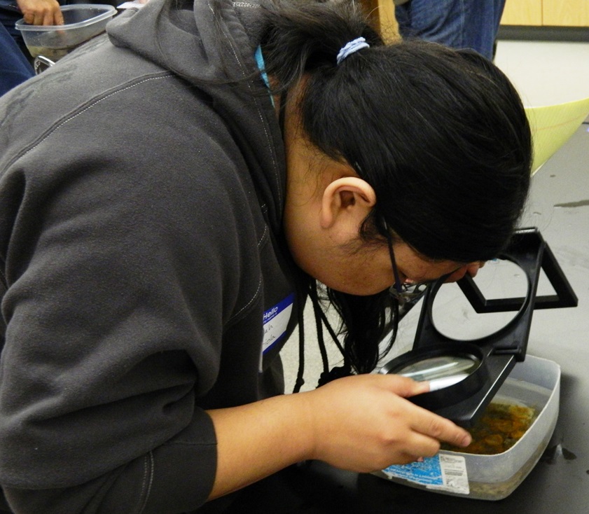 A BioBlitz participant takes a really close look at what’s growing on a collection plate during the lab portion of the workshop.