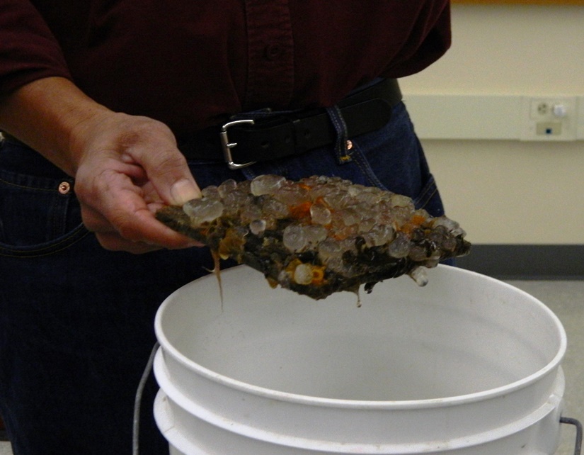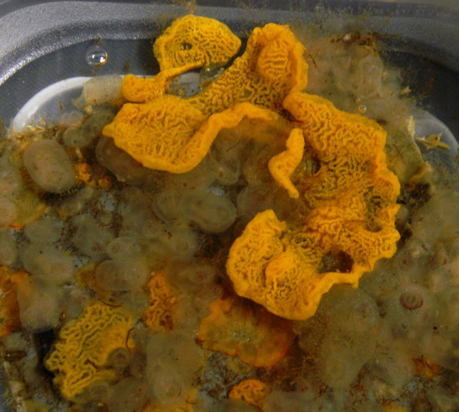 After the lectures, there was a lab, where everyone got some guided hands-on experience identifying the two invasive tunicates, which are usually, but not always, bright orange.