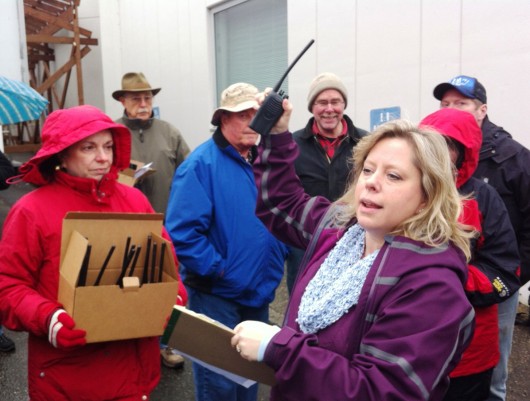 Rhonda Bolling shows prayer circle organizers the walkie-talkies needed to communicate as the large group circles the hospital on Christmas Eve.