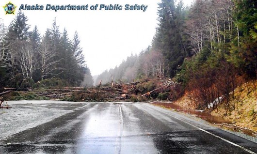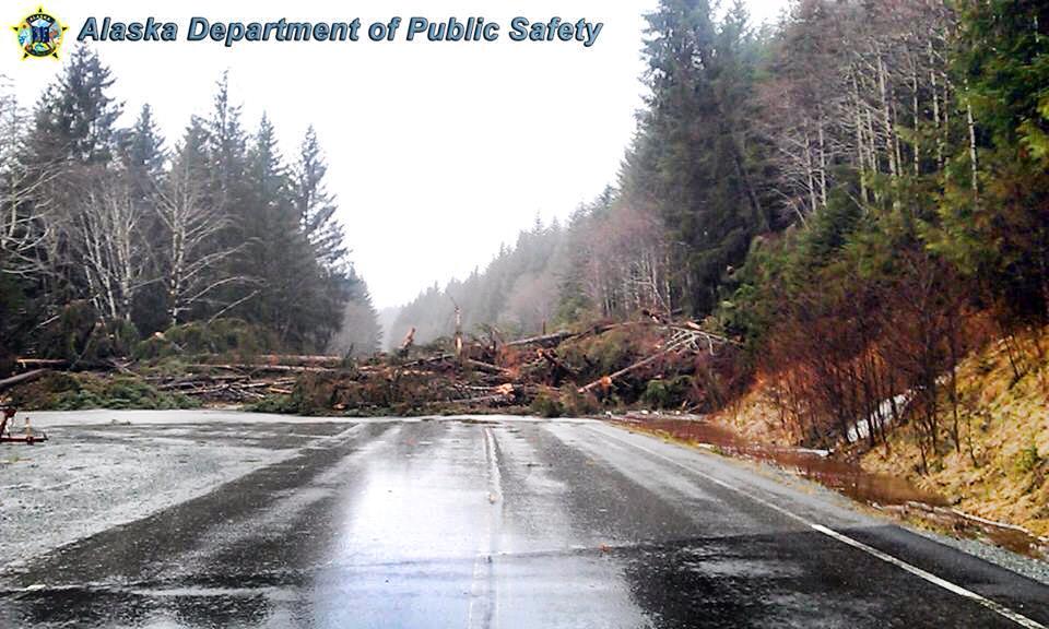 This Alaska Department of Public Safety photo shows a slide blocking a road on Prince of Wales Island.