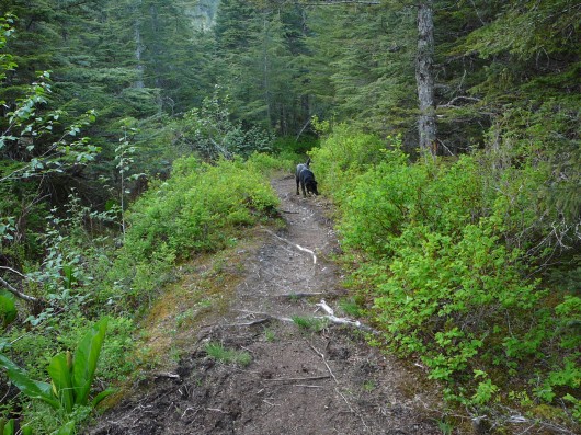 A dog explores part of the Tongass National Forest’s Treadwell Ditch Trail on Douglas Island, part of Juneau. (Ed Schoenfeld/CoastAlaska News)