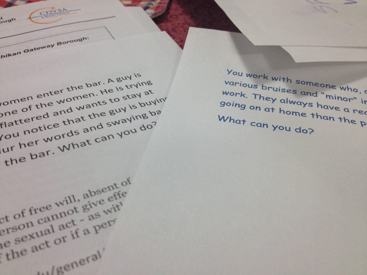 Attendees sat at tables and put themselves in the shoes of a witness to a potentially violent or abusive situation. They talked with each other about what they think the best thing to do in each situation would be.