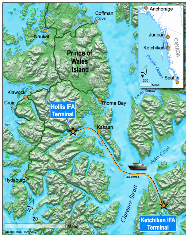 A single ferry leaves the eastern Prince of Wales Island port of Hollis each morning. It arrives in Ketchikan about three hours later, and then waits ‘til the evening to sail back.