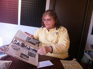 Susan Stone looks through a collection of old newspaper articles while reminiscing about the 1964 Good Friday Earthquake.
