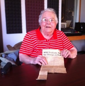 Evelyn Bullock displays a clipping from the 1964 article she wrote shortly after the Good Friday Earthquake.