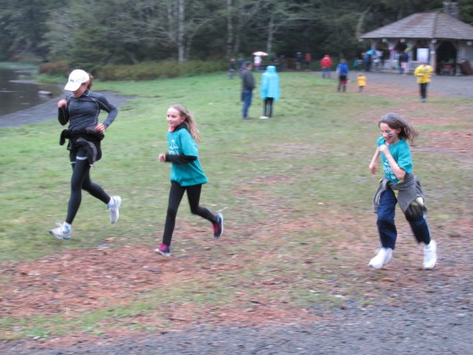 The girls wore turquoise T-shirts with the Girls on the Run logo. Each has the number 1 pinned to the back. They run in the drizzle next to coaches who have been with them for the whole 12-week program.