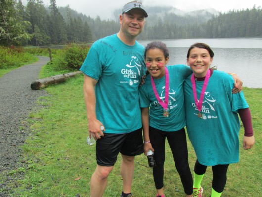 Chad ran the 5K with 11-year-old Jasmine Stevens. She wore a pink medal around her neck after finishing the run.