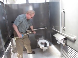 “This bathroom is really quite high tech. As you can see the louvers on it allow for self-policing by the community. When you see more than one set of legs in there you know that you probably need to call the authorities. There is a motion-detection lighting system that, at nighttime, lights up the signs on the outside. But when somebody goes inside the facility it turns off the outside lighting and turns on interior lighting. You can see the light coming up and out of the louvers to help to identify that it is in use. The lighting is a special anti-vein lighting, kind of a bluish color, the same color as your veins, making it hard to use illicit drugs in there.”