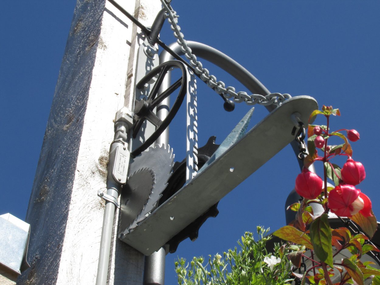 Public art was also revealed during the ceremony. Metalsmith Rich Stage created four plant hangers that are mounted at the top of two lamp posts on the bus shelter near the loo. Reproductions of watercolors by Elizabeth Rose grace the signs on the outside of the bathroom itself.