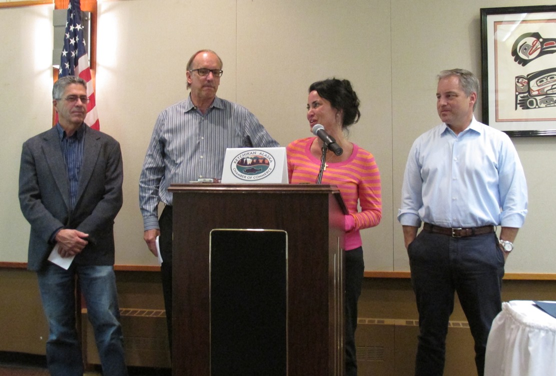 Sen. Lesil McGuire speaks during the special Ketchikan Chamber of Commerce event on Monday, just before Gov. Sean Parnell, right, signed SB99 into law.