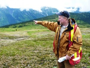 Brent Murphy stands on a windy, alpine ridge covered with short plants and wildflowers. He’s overlooking a deep valley, not far from the Alaska border.