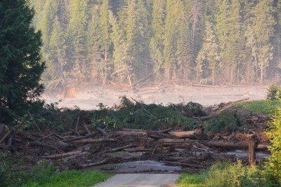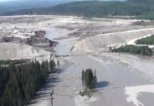 This aerial image shows Monday’s Mount Polley Mine tailings dam break and some of the damage downstream. Fishing and environmental groups say the same could happen at new B.C. mines near the Southeast border. (Cariboo Regional District Emergency Operations Centre photo)