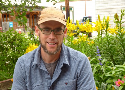 Gitanyow Fisheries Authority Fish and Wildlife Biologist Kevin Koch talks about mine impacts in a small park in Old Hazelton, B.C. (Ed Schoenfeld, CoastAlaska News)