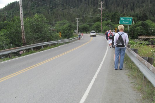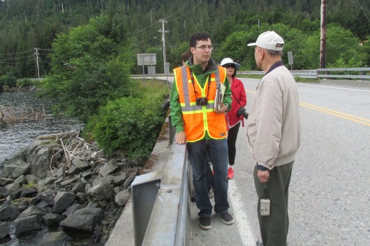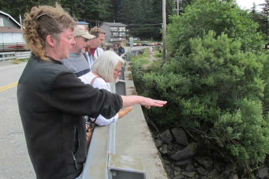 On a recent weekday morning, Sourdough Tours guide Laurie Weller is leading a group of about 20 cruise ship tourists onto the shoulder of the South Tongass bridge.