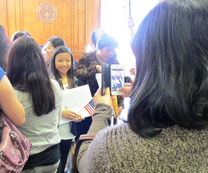 After the ceremony, the new citizens and their family members flocked to pose for photos with Magistrate Longenbaugh, Gary Johnson and the courtroom’s large U.S. flag.