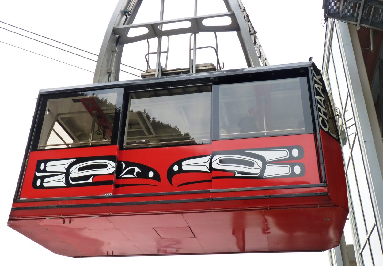 Goldbelt’s Mt. Roberts Tram gondola Chaak (Eagle) enters its loading bay near Juneau’s waterfront. (Ed Schoenfeld, CoastAlaska News)