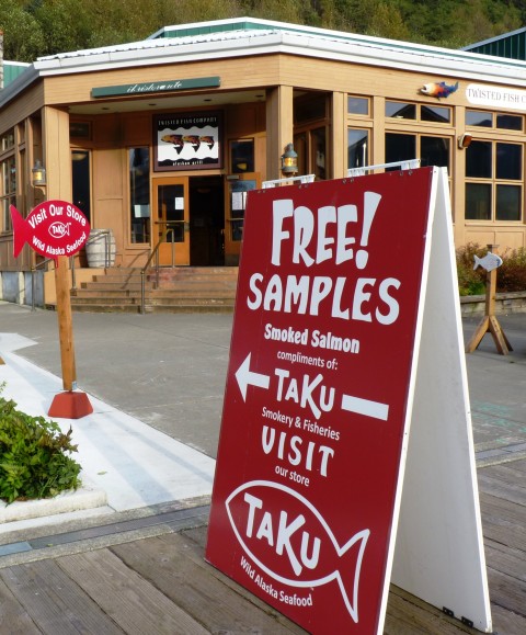 A sign directs visitors to the Taku Fisheries shop on Juneau’s waterfront. (Ed Schoenfeld, CoastAlaska News)