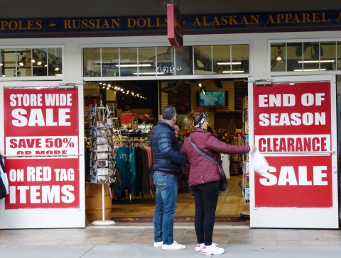 Tourists consider checking out a sale on South Franklin Street, Juneau’s gift-shop row, on Sept. 24. (Photo by Ed Schoenfeld/CoastAlaska News)