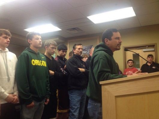 Former Kayhi football coach Les Silva talks to the Ketchikan School Board with football players standing behind him.