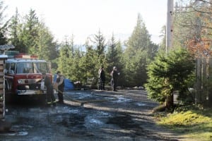 Fire officials and Alaska State Troopers investigate a Wednesday house fire on Blackberry Lane. (KRBD photo)