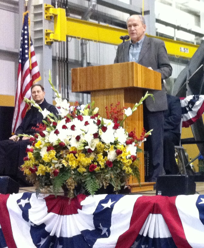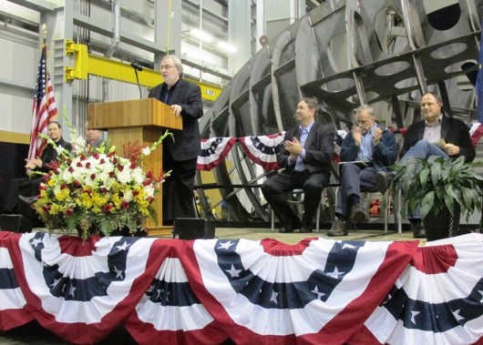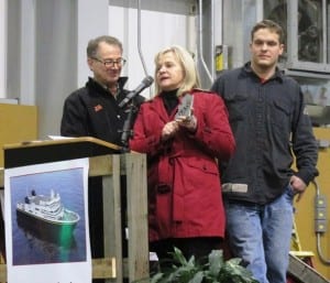 The speakers featured are Doug Ward, director of shipyard development; the Rev. Scott Settimo of Holy Name Parish, who blessed the keels; Robert Venables, chair of the Alaska Marine Transportation Advisory Board; Ted Leonard, executive director of the Alaska Industrial Development and Export Authority; Adam Beck, president of Vigor Alaska; Gov. Bill Walker and first lady, Donna Walker.