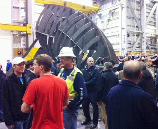 Ketchikan residents chat with shipyard workers after the keel-laying ceremony. One of the keels is seen in the background.