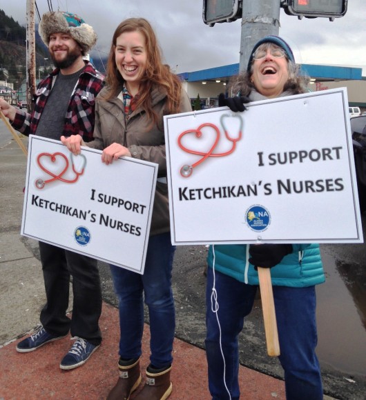 It’s a little after 8 on a frosty morning at the busy corner of Tongass Avenue and Jefferson Street. About a dozen people are waving signs at commuters, asking for honks in support of the Ketchikan Nurses Association.