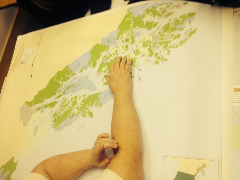 Project manager for the plan amendment, Susan Howle , laid out how the open house would work. “ What we did was we’ve set up the room by stations and our stations are kind of focused on what are issues are for analysis.” The amendment addresses four issues. Howle points around the room to each of the stations: Foldout tables with maps, graphs and Forest Service employees to answer questions . “Young growth transition, renewable energy, roadless areas and then over here we have wildlife habitat and the conservation strategy.”