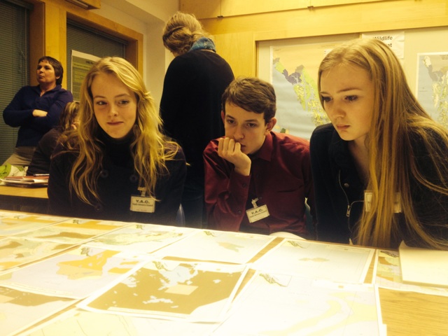 Y.A.C. members Ella Sherril, Sage Acteson and Cheyenne Matthews look over maps at the Tongass National Forest open house in Ketchikan on Monday February 2, 2015.