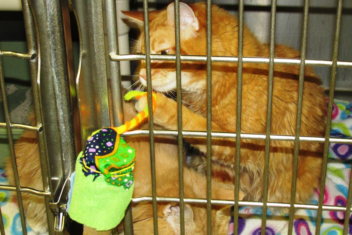 One of the many cats at the Ketchikan Gatgeway Borough Animal Shelter plays with a donated, hand-made cat toy.