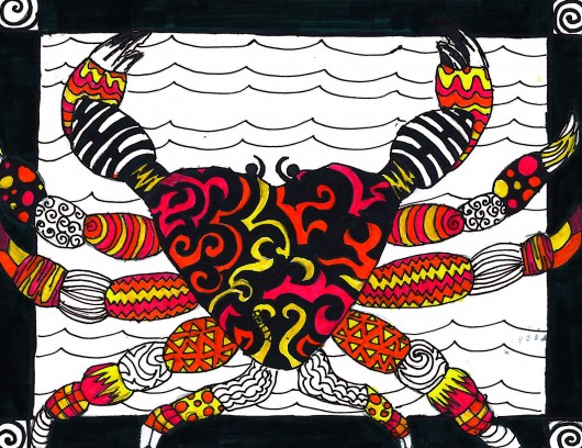 “ I drew a crab and the legs and every part of the legs and the body I drew different designs and I colored it in with orange , red and yellow.”