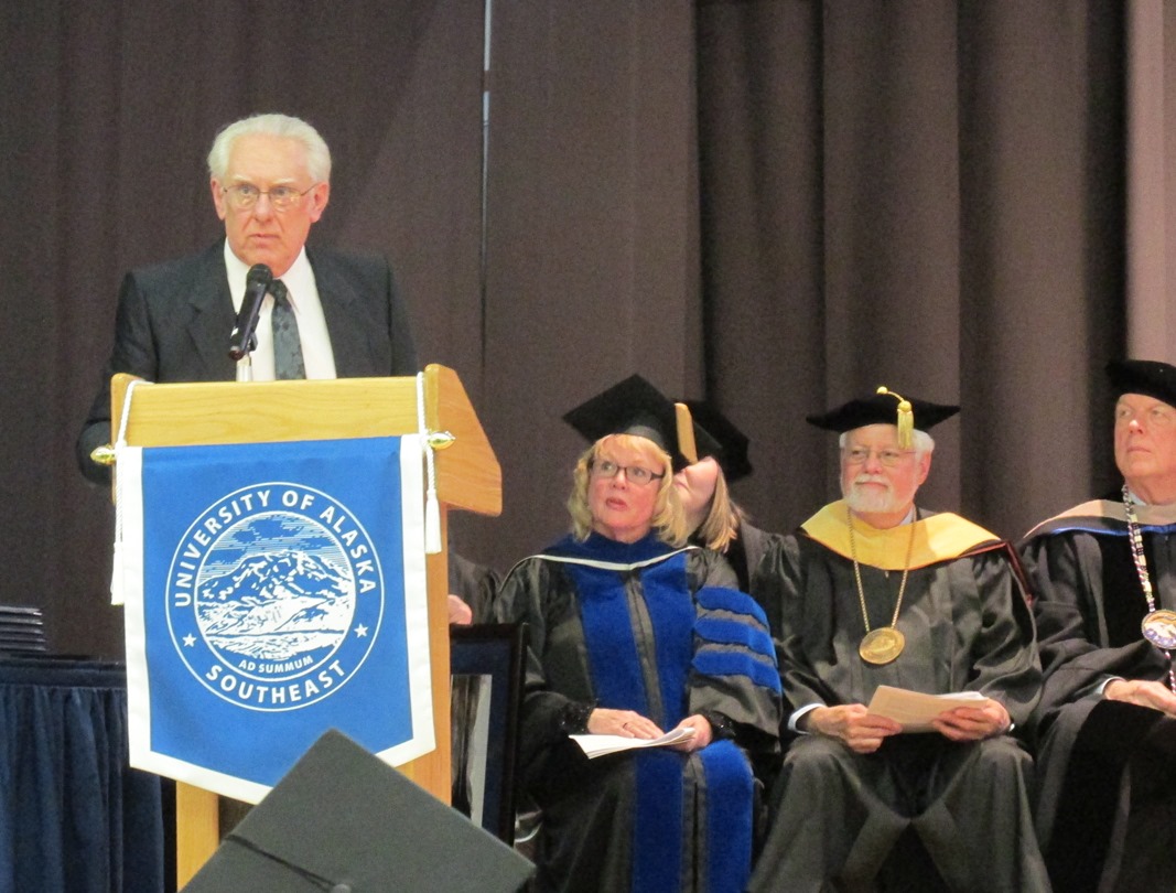 Other speakers during Saturday’s graduation ceremony were UAS Chancellor John Pugh, University of Alaska President Patrick Gamble; and Commencement Speaker Doug Ward. Longtime band director and music teacher Roy McPherson received a Meritorious Service Award.
