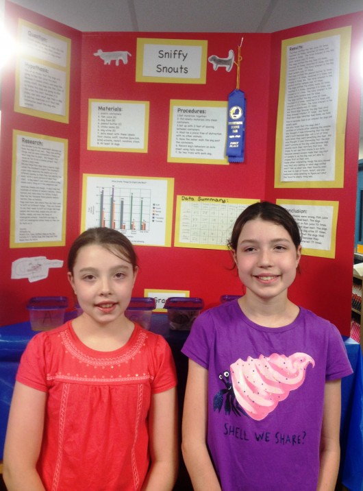 Twins Anneliese and Genevieve Hiatt with their project, Sniffy Snouts at Houghtling Elementary Science Fair on May 13, 2015.