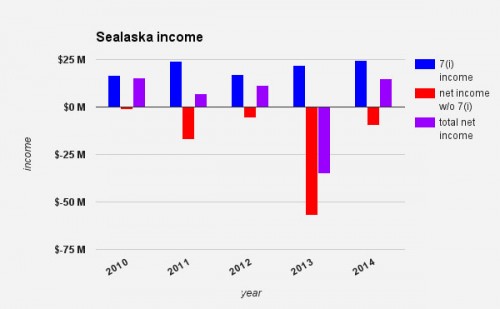 Figures from Sealaska annual reports show no real profits during the past five years. Pooled natural-resource earnings from other regional Native corporations, known as 7(i), balanced all but 2013’s budgets. (Jennifer Canfield/KTOO)
