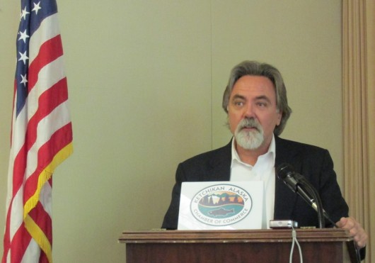 Randall Hoffbeck, DOR commissioner, speaks to the Ketchikan Chamber of Commerce. (Photo by Leila Kheiry)