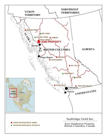 The KSM, Red Chris and Galore Creek projects are among several others planned for northwest British Columbia, near the Alaska border. (Map courtesy Seabridge Gold)