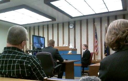 David Mason (far left) and his attorney Marcelle McDannel (far right) watch as State Prosecutor Ben Hofmeister (second from right) question forensic scientist Jennifer Foster via video conferencing. Also pictured is officer Charles Johnson, second to the left.