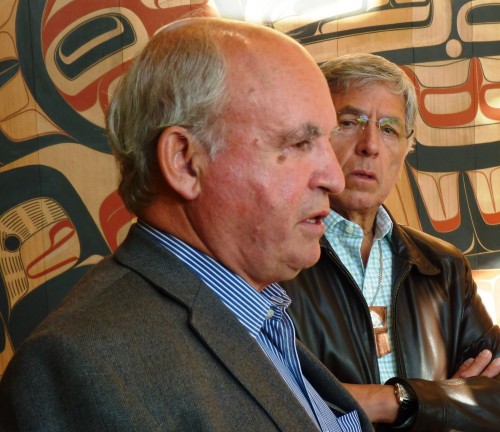 B.C. Minister of Mines Bill Bennett, left, discusses his trip up the Taku River with Lt. Gov. Byron Mallott in the Walter Soboleff Center lobby Aug. 24 in Juneau. (Photo by Ed Schoenfeld/CoastAlaska)