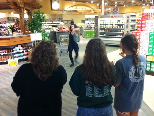 “I’ve been doing bubble flash mobs. That’s kind of like a random act of art, but I’ve never done the hoop part in a grocery,” she said. “It’s something new, something exciting. It’s good. Trying to do something random, trying to get people’s attention; that’s the tricky part.”