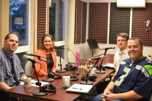 School Board candidates (L-R) Conan Steele, Misty Archibald, Matt Eisenhower and Matt Tibbles at KRBD.