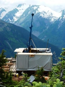 A drill rig grinds into the bedrock of a high ridge, overlooking a wilderness of snow-capped mountains and lushly vegetated valleys. The bright blue rig juts up through the roof of a rough shack of sturdy tarps, sheets of plywood and heavy timber.