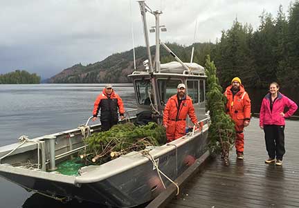 Shoal Cove is accessed from Ketchikan by boat or float plane. Art Williams (boat operator), Aaron Steuerwald (forester), Steve Hollis (seasonal forestry technician), and Crystal Vieira (seasonal forestry technician) loaded the trees. (USFS photo)